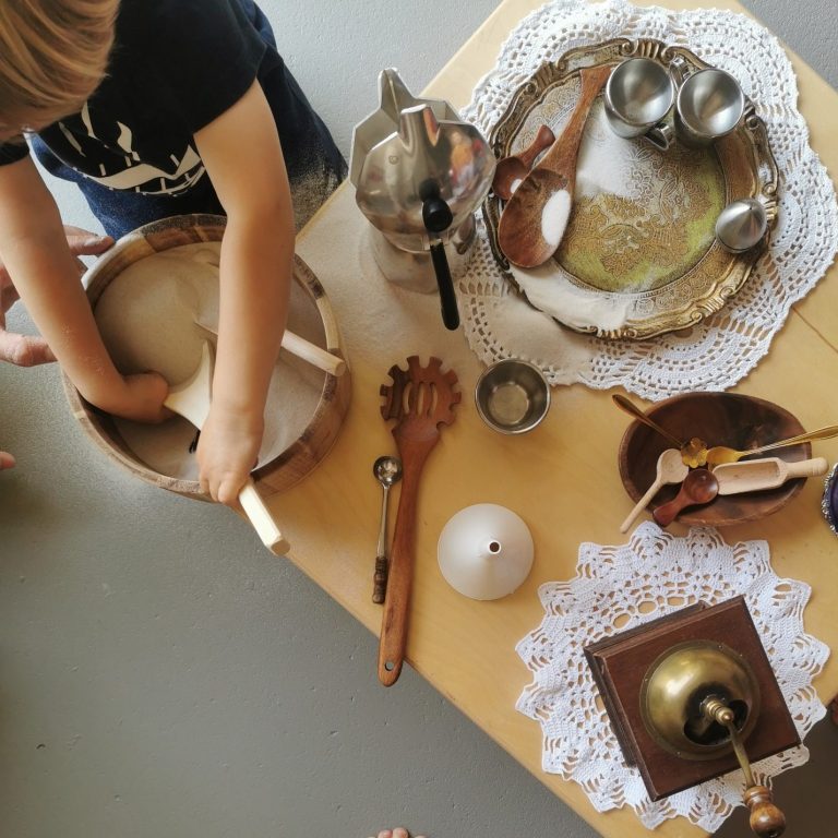 Im SandSpielRaum befinden sich, ähnlich wie im SpielRaum, unterschiedliche, offene Materialien die zum Spielen und Experimentieren mit dem feinen Sand einladen.